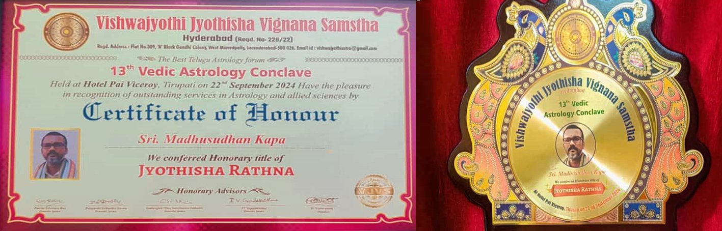 Madhusudhan Kapa is a respected scholar and practitioner in the fields of Jyothisham (Vedic Astrology) and Vasthu Shastra. With a comprehensive academic background that includes a Diploma in Jyothisha and Vasthu from Rashtriya Sanskrit Vidyapeetham, he has dedicated years to the study and practical application of these ancient Indian sciences.